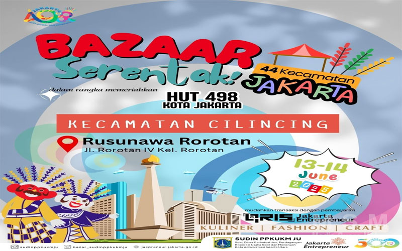 MediaSuaraMabes, Jakarta – Dalam rangka menyambut Hari Ulang Tahun (HUT) ke-498 Kota Jakarta, Pemerintah Provinsi DKI Jakarta menggelar bazaar serentak di 44 kecamatan yang tersebar di lima wilayah kota dan satu kabupaten kepulauan seribu. Salah satu titik pelaksanaan acara tersebut akan berlangsung di Rusunawa Rorotan, Kecamatan Cilincing, Jakarta Utara, pada 13–14 Juni 2025.