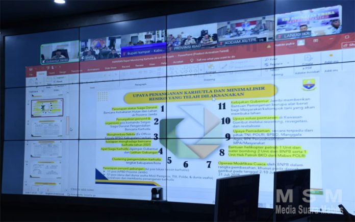 MediaSuaraMabes, Kampar – Menghadapi musim kemarau panjang yang berpotensi meningkatkan risiko kebakaran hutan dan lahan (Karhutla), Pemerintah Kabupaten Kampar terus memperkuat upaya pencegahan dan penanggulangan. Senin (28/7/2025), Bupati Kampar, H. Ahmad Yuzar, S.Sos., M.T., Wakil Bupati Kampar, Dr. Misharti, S.Ag., M.Si., dan Kapolres Kampar, AKBP Boby Putra Ramadhan, S.I.K., ikut serta dalam Zoom Meeting Rapat Monitoring Situasi Terkini Penanganan Karhutla yang diselenggarakan oleh Badan Nasional Penanggulangan Bencana (BNPB) Pemerintah Pusat.
