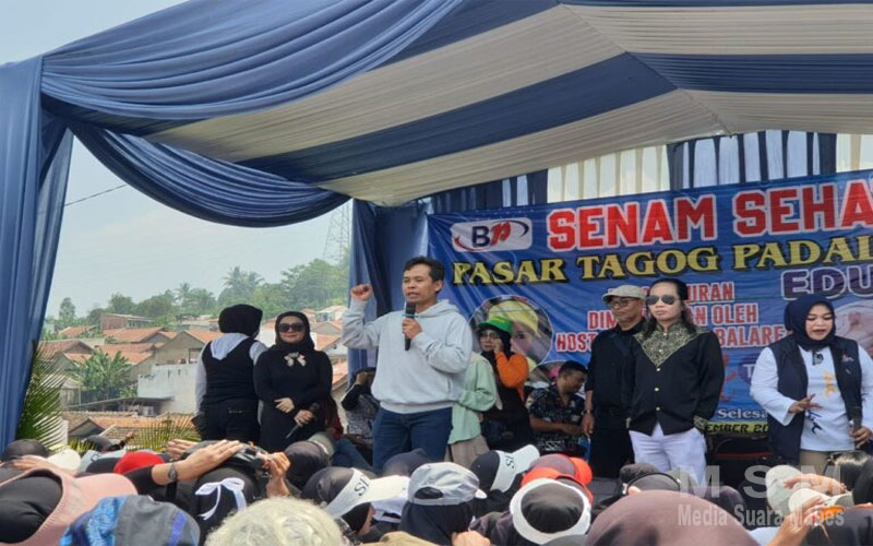 BeritaSembilan, KBB – pasangan calon (Bapaslon) Bupati Bandung Barat Edi Rusyandi dan Wakil Bupati Unjang Asari mengadakan Senam sehat bersama ratusan Ibu – Ibu dan kaum melinial di Karpak lantai3 pasar moderen Padalarang dengan berbagi hadiah Dorprez di bantu dengan panitia pelaksana untuk dukungan dari ber bagai komunitas senam di Kabupaten Bandung Barat (KBB).