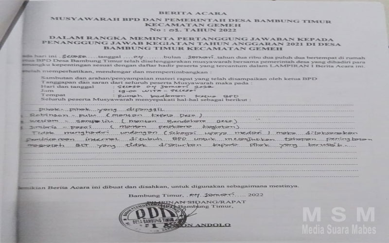 Informasi ini didukung oleh berita acara musyawarah BPD dan Pemerintah Desa Bambung Timur nomor 01 tahun 2022 dalam rangka meminta pertanggungjawaban kepada penanggung jawab kegiatan tahun anggaran 2021.