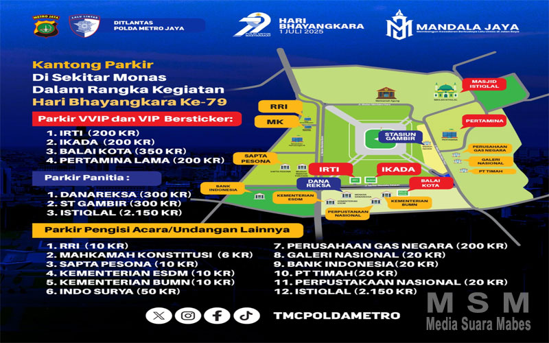 MediaSuaraMabes, Jakarta — Kepada seluruh pengguna jalan, khususnya pengendara bermotor, diimbau untuk menghindari sejumlah ruas jalan di sekitar kawasan Monas, Jakarta Pusat, sehubungan dengan pelaksanaan Hari Ulang Tahun (HUT) ke-79 Bhayangkara Kepolisian Republik Indonesia (Polri) yang akan digelar pada Selasa, 1 Juli 2025.