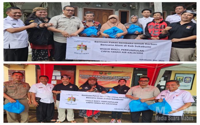 BeritaSembilan (MSM Network), Sukabumi – Pada hari Rabu 11 Desember 2024 bertempat di kantor Kecamatan Cisolok Sukabumi, Perkumpulan cinta tanah air Kalacakra yang dipimpin oleh Eric Torania Khan atas inisiatif Ketua Dewan Pengawas Kalacakra Mayjend (TNI) Rido Hermawan, memberikan bantuan berupa paket sembako yang diserahkan langsung oleh Kalacakra kepada Jenal Abidin Camat Cisolok Sukabumi untuk diteruskan kepada masyarakat terdampak bencana alam pergeseran tanah Sukabumi di daerah Cisolok dan sekitarnya.