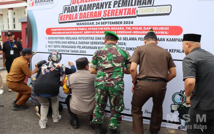 Deklarasi itu diteken Ketua Bawaslu, Ketua KPU, Forkompinda Kab Belitung Timur, Kedua Bacalon Bupati dan Wakil Bupati Belitung Timur, serta parpol peserta Pemilu, insan pers/wartawan dan tamu undangan lainnya. (edi babel).