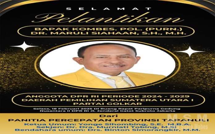 BeritaSembilan (Jaringan MSM), Medan – Keluarga Besar Panitia Percepatan Provinsi Tapanuli (PPPT) menyampaikan ucapan selamat atas pelantikan Bapak Kombes. Pol. (Purn.) Dr. Maruli Siahaan, S.H., M.H. Anggota DPR RI Daerah Pemilihan Sumatera Utara I Partai Golkar masa jabatan periode 2024 – 2029.