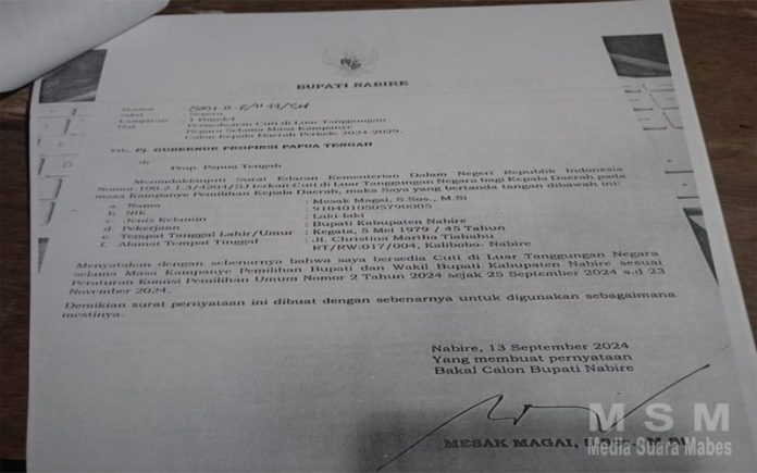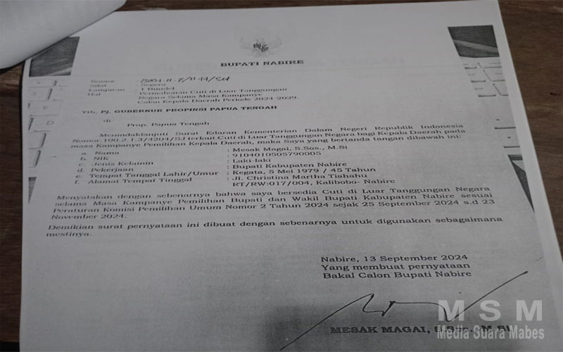 Bupati Mesak Magai diketahui telah menerima izin cuti dari Gubernur Papua Tengah, terhitung mulai tanggal 25 September 2024, Karena Maju kembali sebagai calon bupati nabire.