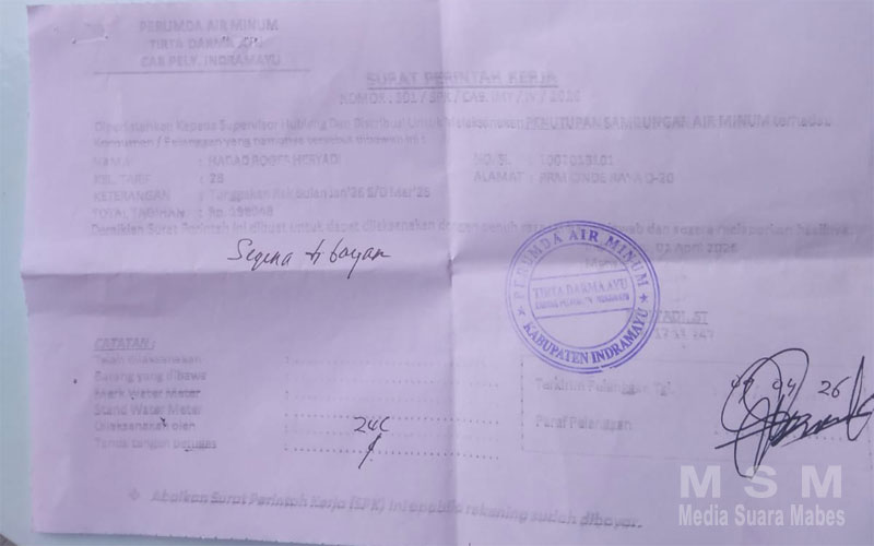 MediaSuaraMabes, Indramayu – Sejumlah konsumen Perusahaan Umum Daerah Air Minum (Perumdam) Tirta Dharma Ayu Kabupaten Indramayu mengeluhkan adanya surat teguran yang dinilai bernuansa ancaman, terkait keterlambatan pembayaran rekening air.
