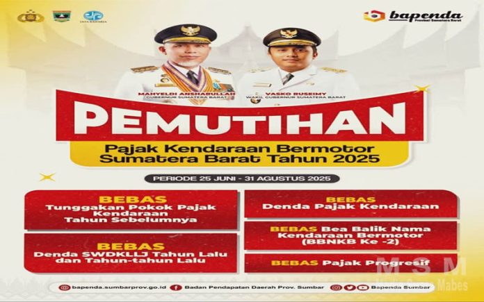 MediaSuaraMabes, Sumbar – “Bismillah. Mulai 25 Juni sampai 31 Agustus 2025, kami himbau kepada seluruh masyarakat Sumatera Barat untuk ikut serta dalam Program Pemutihan Pajak Kendaraan Bermotor. Ini adalah hadiah dari Hari Kemerdekaan Republik Indonesia ke-80 tahun 2025,” ujar Mahyeldi dalam keterangan resminya, Selasa (24/6/2025).