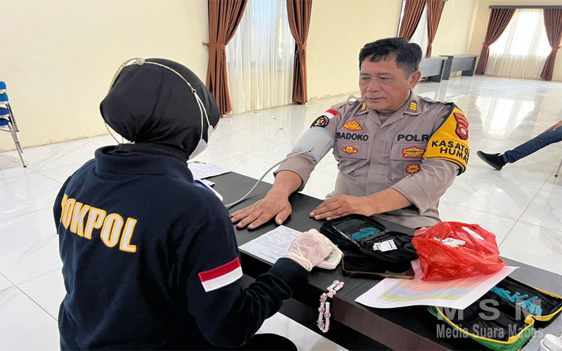 BeritaSembilan (MSM Group), Sambas Kalbar | Polres Sambas, Guna memastikan seluruh personel Operasi Mantap Praja (OMP) Kapuas Polres Sambas dalam kondisi sehat, Kompol Isbullah S.H., selaku Kasatgas BanOps OMP 2024, bahwa Jajaran Polres Sambas menjalani pemeriksaan kesehatan rutin. Pemeriksaan ini dilakukan oleh Satuan Tugas Bantuan Operasi (Satgas Banops) Subsatgas Yankes pada Selasa, 22 Oktober 2024, bertempat di Aula Dhira Wijaya Polres Sambas.