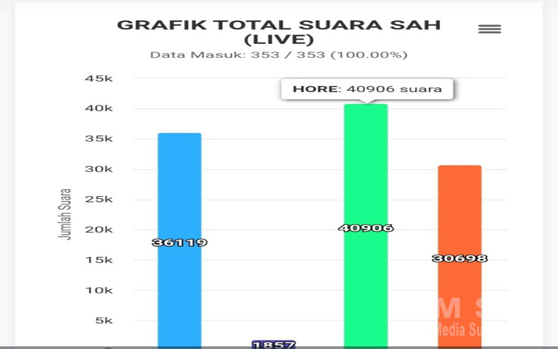 Ditambahkannya, perhitungan real count juga dapat diperbandingkan dengan sumber reel count lainnya. Selisihnya, kata dia, tidak jauh berbeda dan tetap dimenangkan oleh pasangan nomor 3 Oloan-Rebeka. Selisih suara antara pasangan nomor urut 3 dengan Paslon lain di bawahnya sekitar 4,5 persen lebih.