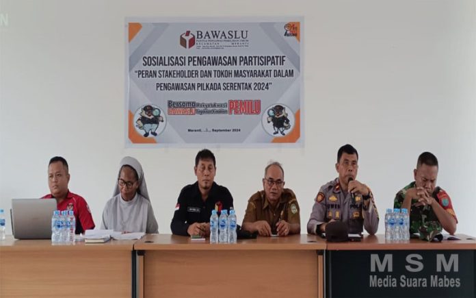 BeritaSembilan, Meranti Landak Kalbar ~ Kapolsek Meranti, Ipda Uwes, S.H bersama anggotanya melaksanakan kegiatan Sosialisasi Pengawasan Partisipatif Peran Stakeholder dan Tokoh Masyarakat dalam Pengawasan Pilkada Serentak 2024. Acara ini diselenggarakan di Aula Paroki Hati Kudus Meranti, Dusun Meranti Hilir, Desa Meranti, Kecamatan Meranti, Kabupaten Landak.