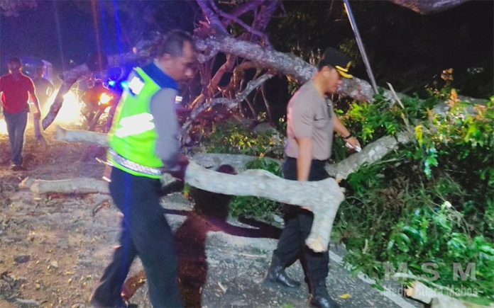 Kapolsek Kawasan Pelabuhan Gilimanuk, Kompol I Komang Muliyadi, SH., M.M., yang mendapatkan laporan langsung bergerak cepat ke lokasi. Didampingi oleh Perwira Pengendali (Padal) Ipda I Ketut Budiasa dan delapan anggota Unit Kecil Lengkap (UKL) I, Kapolsek memimpin langsung evakuasi pohon tumbang tersebut.