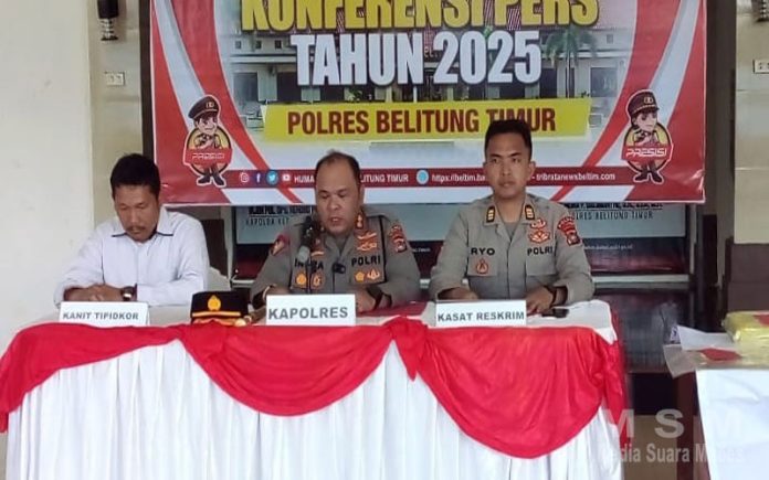 Konferensi Pers di laksanakan di Joglo Patriattama Polres Beltim,Kapolres Beltim juga di dampingi oleh Kasat Reskrim Polres Beltim dan Kanit Tipikor, pada hari Senin (10/02/2025).
