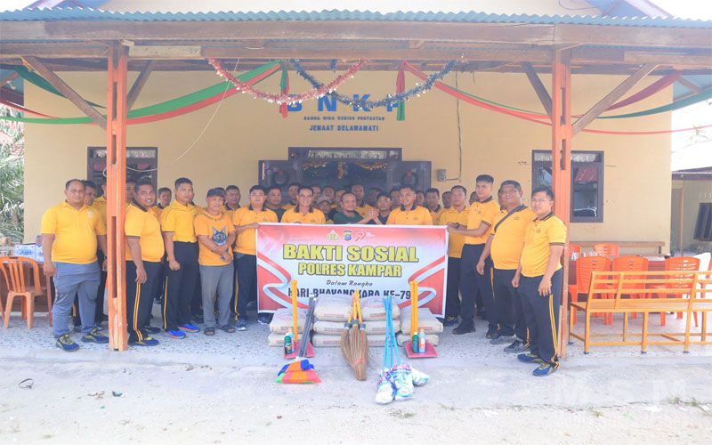 MediaSuaraMabes, Salo Kampar – Dalam rangka memperingati Hari Bhayangkara ke-79, Polres Kampar melaksanakan kegiatan Bakti Sosial (Baksos) dengan melakukan gotong royong membersihkan lingkungan Gereja BNKP Delemawati, Dusun Terang Bulan, Desa Salo, Kecamatan Salo, Kabupaten Kampar, Sabtu (28/6/2025). Kegiatan yang dimulai pukul 10.00 WIB ini menunjukkan komitmen Polri untuk terus hadir di tengah masyarakat dan memberikan pelayanan terbaik bagi seluruh lapisan masyarakat, tanpa memandang agama dan suku.