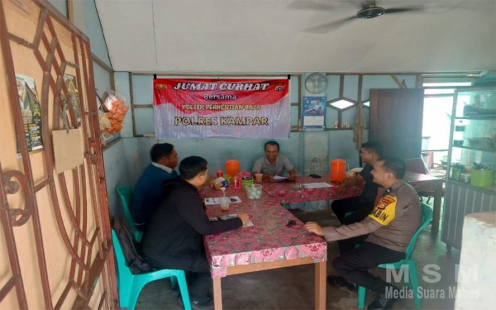 MediaSuaraMabes, Kampar Perhentian Raja – Polsek Perhentian Raja terus berupaya mendekatkan diri kepada masyarakat untuk meningkatkan keamanan dan ketertiban masyarakat (Kamtibmas). Jumat (18/7/2025), pukul 09.00 WIB, Polsek Perhentian Raja melaksanakan program “Jumat Curhat” di Warung Sdr. Joko, Desa Sialang Kubang, Kecamatan Perhentian Raja, Kabupaten Kampar. Kegiatan ini dihadiri oleh Kapolsek Perhentian Raja, Iptu Peri Padli, S.H., yang diwakili oleh Bhabinkamtibmas Desa Sialang Kubang, Bripka Suryatman Akbar, S.H., serta warga Desa Sialang Kubang.