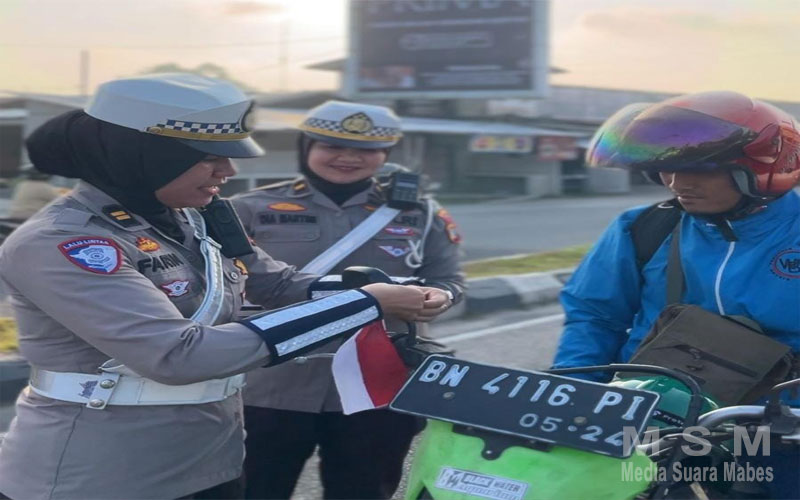 MediaSuaraMabes, Babel – Direktorat Lalu Lintas Polda Bangka Belitung membagikan ratusan bendera merah putih kepada pengendara di simpang lampu merah Air Itam Pangkalpinang.