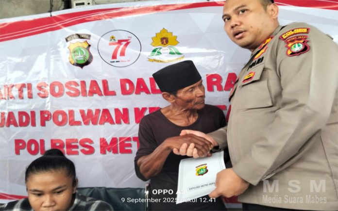 MediaSuaraMabes, Bekasi – Dalam rangka memperingati Hari Ulang Tahun Polisi Wanita (Polwan) ke-77, Wakapolres Metro Bekasi bersama jajaran Mapolsek Tarumajaya melaksanakan kegiatan sosial dengan memberikan bantuan kursi roda kepada warga kampung telar tanggul RT 001 RW 027 Desa segara jaya penyandang disabilitas di wilayah Tarumajaya, Kabupaten Bekasi.