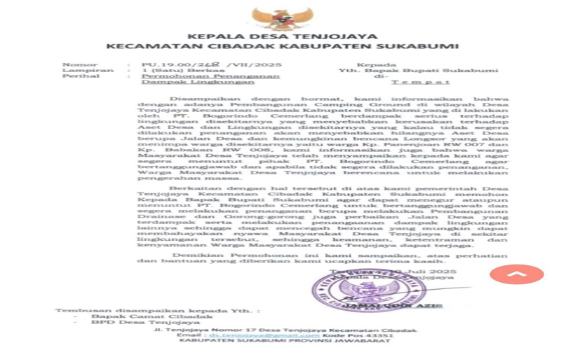 MediaSuaraMabes, Sukabumi — Pemerintah Desa Tenjojaya, Kecamatan Cibadak, Kabupaten Sukabumi, melayangkan surat permohonan kepada Bupati Sukabumi untuk segera menindaklanjuti dampak lingkungan yang ditimbulkan oleh kegiatan pembangunan Camping Ground oleh PT. Bogorindo Cemerlang.